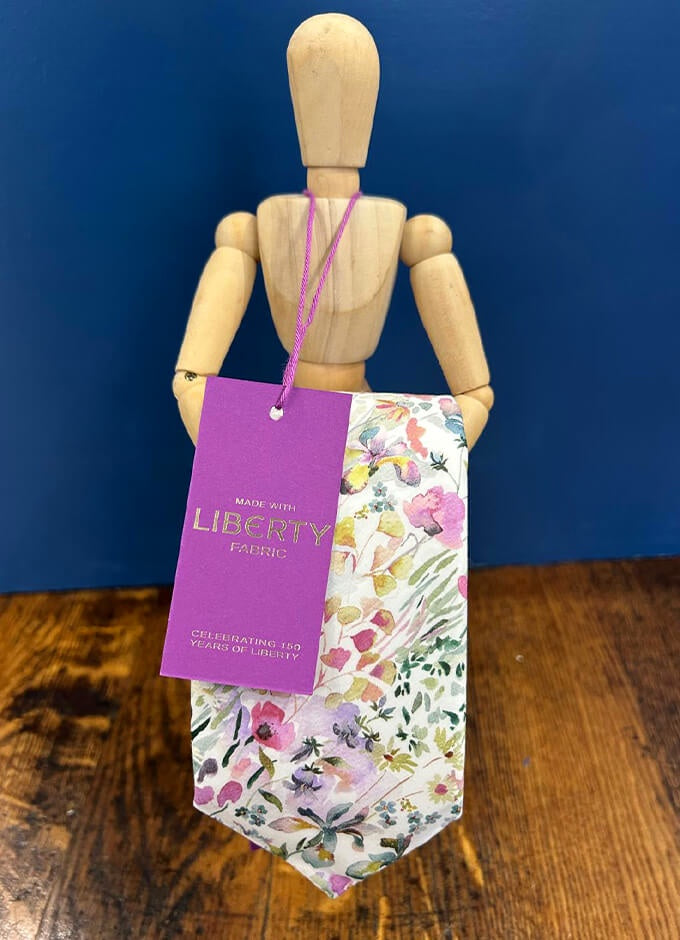 A Felda Cotton Tie Made with Liberty Fabric. An absolutely stunning Van Buck cotton range tie using exclusive Liberty Tana Lawn® printed fabric. This tie uses the Felda Lilac Liberty print featuring an elegant Floral watercolour pattern. The eye pleasing pastels of pinks, greens and blues are sure to compliment your attire and give you a unique sense of style at any event, wedding or party you attend.