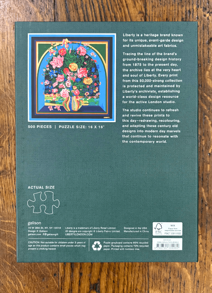 The Liberty Vista 500 Piece Book Puzzle features Liberty's Vista print, a hand painted scene depicting a view through a window with a floral bouquet at the center.