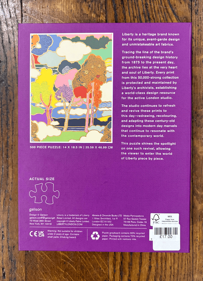 Liberty’s Prospect Road puzzle features 500 pieces, housed in a charming book-shaped box. This puzzle is printed with Prospect Road – an archival classic, based on a Liberty design from 1968. The artwork features a reimagined take on traditional Art Nouveau landscape prints with subtly arranged clusters of trees. Perfect for gifting family and friends, this puzzle offers an absorbing option to while away a quiet afternoon.