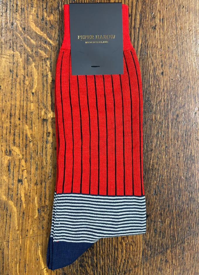 Introducing the scarlet Oxford Stripe luxury men's socks. These resplendent striped men's socks feature a contrasting navy heel and toe, with contrasting white and navy horizontal stripes. Combined with the vertical vivid black stripes these dazzling cotton socks embody the quirkiness that is Peper Harow.