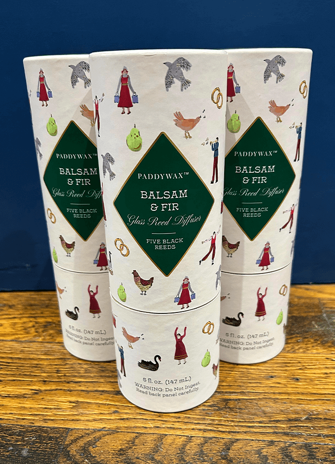 Introducing our new collection of ribbed glass tinted in rich hues and filled with festive scents. Hand illustrated artwork inspired by the classic 12 Days of Christmas adorns each package. Diffusers come in a decorative tube. Just add a bow.