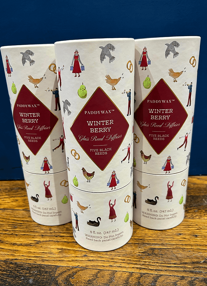 Introducing our new collection of ribbed glass tinted in rich hues and filled with festive scents. Hand illustrated artwork inspired by the classic 12 Days of Christmas adorns each package. Diffusers come in a decorative tube. Just add a bow.