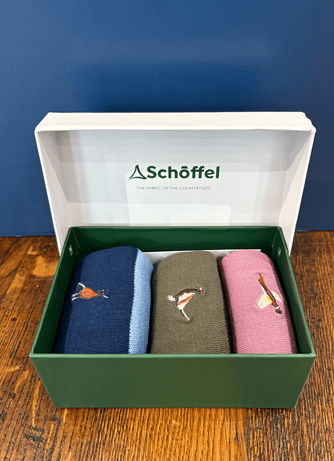 Three pairs of naturally anti-bacterial and soft-on-the-feet bamboo socks, presented in a Schöffel gift box and available in a variety of colours and patterns. An ideal present.