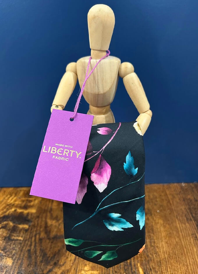 A Herbarium Cotton Tie Made with Liberty Fabric. An absolutely stunning Van Buck cotton range using exclusive Liberty Tana Lawn printed fabric. This tie uses the herbarium print which is a colourful and bold design featuring a striking array of large flowers that really pop over its black background. We also have matching pocket squares as well as bow ties and self-tie bow ties available. This collection includes a range of different Liberty patterns which are all perfect for wedding ties, prom ties, events or even a day in the office. Order yours now and be sure to stand out with your dapper style!