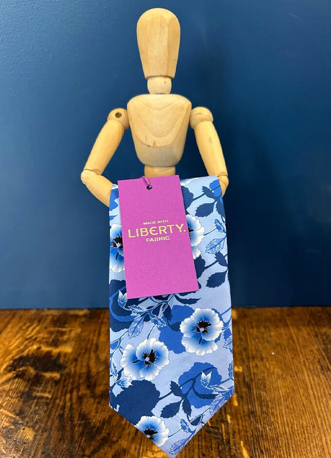 Style doesn't end at the feet - keep well dressed, all over. This Pansy Dot tie by Van Buck is made in England with Liberty Fabric. This tie quite characterful, can be ideal for dressing up - at weddings, or evenings - or can be used to elevate casual styles in your everyday travels. A mid blue floral print sitting against a pale blue backdrop.